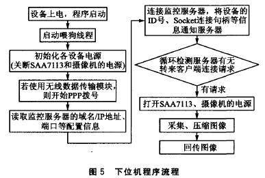 下位機軟件通過驅動程序提供的接口,在遠程圖像監(jiān)控設備中完成硬件的初始化、控制等功能,同時又負責圖像的壓縮和傳輸。它是所有設備的控制中樞,因此這里著重描述下位機軟件的工作流程,如圖5所示。