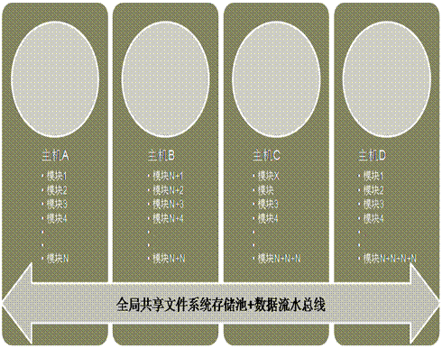 該技術(shù)方案是依靠在存儲(chǔ)管理虛擬層上構(gòu)建并行文件系統(tǒng),實(shí)現(xiàn)所有業(yè)務(wù)主機(jī)共享同一份數(shù)據(jù)視圖,實(shí)現(xiàn)并發(fā)數(shù)據(jù)共享訪問(wèn)的架構(gòu)設(shè)計(jì)方案。其架構(gòu)示意圖如下: