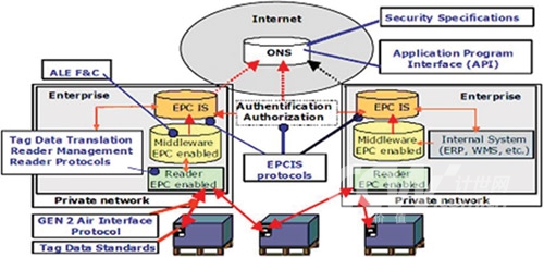 EPCglobal提出了Auto-ID系統(tǒng)的五大技術(shù)組成,分別是EPC(電子產(chǎn)品碼)標(biāo)簽、RFID標(biāo)簽閱讀器、ALE中間件實(shí)現(xiàn)信息的過(guò)濾和采集、EPCIS信息服務(wù)系統(tǒng),以及信息發(fā)現(xiàn)服務(wù)(包括ONS和PML)。由于從一開(kāi)始就讓世界各大洲的從業(yè)人員充分參與,EPCGlobal標(biāo)準(zhǔn)(架構(gòu)圖如下)得到了較廣泛認(rèn)同,這里不再對(duì)其標(biāo)準(zhǔn)體系架構(gòu)贅述。