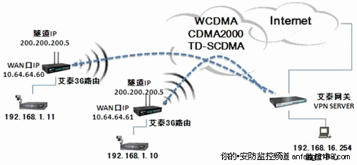 此組網(wǎng)方案是在艾泰3G路由器連接到公網(wǎng)監(jiān)控中心的基礎上建立VPN隧道方式來傳輸視頻圖像,組網(wǎng)實施如下: