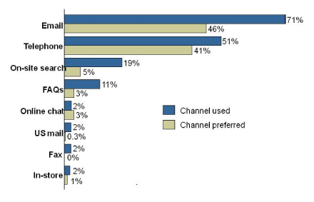 正是基于這一點(diǎn)供應(yīng)商們紛紛加入PeopleSupport的陣營(yíng),并且在這之后不久統(tǒng)一的排隊(duì)技術(shù)就問(wèn)世了,更在之后發(fā)展成全面集成的聯(lián)絡(luò)中心解決方案和eCRM套件。這些系統(tǒng)允許聯(lián)絡(luò)中心將電話(huà)流與交談、電子郵件、郵寄信件和傳真混合起來(lái),現(xiàn)在,SMS也來(lái)了。Forrester調(diào)研機(jī)構(gòu)2005年進(jìn)行了一個(gè)調(diào)研,意在檢測(cè)客戶(hù)偏愛(ài)的聯(lián)絡(luò)渠道有哪些以及他們實(shí)際使用的渠道又是哪些。該調(diào)研貫穿全美所有類(lèi)型的企業(yè)(并不局限于電子零售商或DOT.COM們)