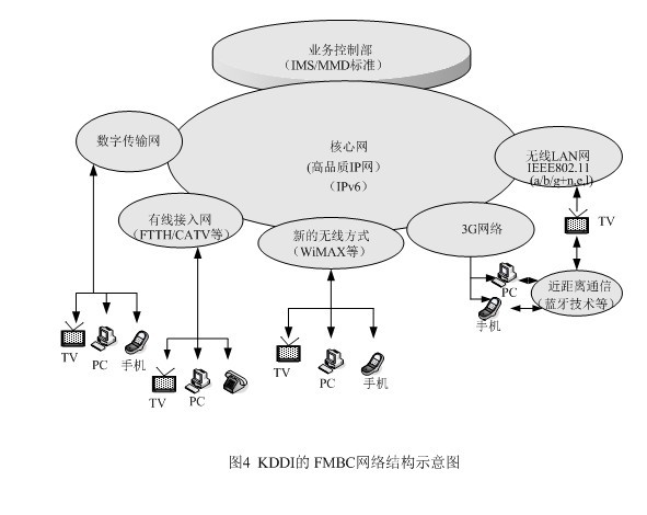 為了在市場競爭中立于不敗之地,KDDI另辟稀徑,提出了將固定網(wǎng)、移動(dòng)網(wǎng)、因特網(wǎng)和電視廣播相融合的概念,它與朝日新聞、朝日電視簽署合作框架,就是它的集中代表。FMBC是超3G的構(gòu)想,是以移動(dòng)通信為基礎(chǔ),與固定電話網(wǎng)及因特網(wǎng)進(jìn)行融合,現(xiàn)在又把廣播電視納入,這樣它就成了KDDI的NGN了。FMBC的網(wǎng)絡(luò)結(jié)構(gòu)請見圖4。從圖4上不難發(fā)現(xiàn)NGN的影子,特別是業(yè)務(wù)控制部的設(shè)立,并采用ISM/MMD標(biāo)準(zhǔn),將網(wǎng)絡(luò)與應(yīng)用分開,以利新業(yè)務(wù)的開拓,同時(shí)完成核心網(wǎng)的IP化,這些都是NGN的基本概念。