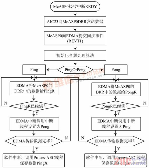 基于DSP 的實(shí)時(shí)處理的實(shí)現(xiàn),本文將AIC23 采集到的數(shù)據(jù)先存儲(chǔ)到SDRAM 中,在需要處理的時(shí)候利用EDMA 實(shí)現(xiàn)Ping Pong 緩沖,將待處理的數(shù)據(jù)分批搬運(yùn)到片內(nèi)存儲(chǔ)器,結(jié)合高速緩存和片內(nèi)內(nèi)存設(shè)計(jì)合適的數(shù)據(jù)結(jié)構(gòu),并將數(shù)據(jù)對(duì)齊,這樣大大減小了數(shù)據(jù)搬移帶來(lái)的開(kāi)銷。