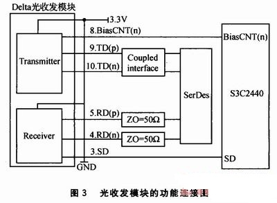 光收發(fā)模塊的功能連接圖如圖3所示。其中3.SD是光收發(fā)模塊的第3個引腳,它的功能可以描述為有光輸入時為邏輯高,否則為邏輯低;4.RD(n)是第4個引腳,反向接收數(shù)據(jù)的輸出;5.RD(p)是第5個引腳,正向接收數(shù)據(jù)的輸出;8.BiasCNT(n)是第8個引腳,控制ONU突發(fā)模式操作的負脈沖;9.TD(p)是第9個引腳,正向發(fā)送數(shù)據(jù)的輸入;10.TD(n)是第10個引腳,反向發(fā)送數(shù)據(jù)的輸入。