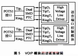 VOIP模塊的功能連接圖如圖5所示。Dual SMD PTC叫做雙重熱敏電阻,可對過熱和過流雙重作用導(dǎo)致的電路故障進行保護;Tip and Ring(正極線和負極線)表示組成電話配線電路的兩條電線,Tip是正極線的別稱,Ring是負極電線的別稱。