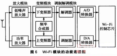 Wi—Fi模塊的功能連接圖如圖6所示。本系統(tǒng)的天線是外置天線,這樣能盡量穩(wěn)定信號。天線與RF射頻模塊相連,RF射頻模塊大致可分為放大模塊、變頻模塊、調(diào)制解調(diào)模塊等有源部件,然后通過A/D、D/A轉(zhuǎn)換與Wi—Fi控制芯片相連。Wi—Fi控制芯片控制整個無線模塊的運行。