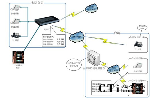 “兩岸通”利用最新的VOIP技術(shù),實(shí)現(xiàn)大陸固話辦公電話系統(tǒng)通過互聯(lián)網(wǎng)遠(yuǎn)程連接到臺灣的電話系統(tǒng),實(shí)現(xiàn)兩岸低資費(fèi)甚至零資費(fèi)電話互打。