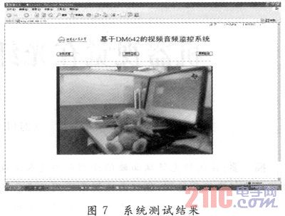 在集成開(kāi)發(fā)環(huán)境CCS(C6000)下,加載相關(guān)驅(qū)動(dòng)程序,對(duì)本系統(tǒng)進(jìn)行了測(cè)試。CCD攝像頭為標(biāo)準(zhǔn)PAL制式,圖像采集的幀頻為25幀/s,圖像的分辨率為720×576像素。測(cè)試結(jié)果如圖7所示。測(cè)試結(jié)果表明,網(wǎng)絡(luò)連接正常,用戶在PC端可通過(guò)瀏覽器訪問(wèn)系統(tǒng),成功實(shí)現(xiàn)遠(yuǎn)程監(jiān)控。