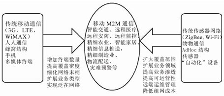 無線傳感器網(wǎng)絡(luò)(WSN)和移動(dòng)通信的結(jié)合,既是無線傳感器網(wǎng)絡(luò)產(chǎn)業(yè)發(fā)展的需要,也是移動(dòng)通信產(chǎn)業(yè)發(fā)展的需要,如圖1所示,這種結(jié)合可以解決兩個(gè)產(chǎn)業(yè)的諸多發(fā)展瓶頸,大大擴(kuò)展兩個(gè)產(chǎn)業(yè)的業(yè)務(wù)應(yīng)用領(lǐng)域,帶來很多新的機(jī)遇。