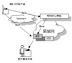 國際上一些先進(jìn)的 呼叫中心產(chǎn)品供應(yīng)商現(xiàn)在已經(jīng)把 Web 技術(shù)引入到他們的產(chǎn)品中了。通過屏幕上的一個(gè)按鈕可以利用 Internet 電話把客戶和呼叫中心連接起來。客戶使用一個(gè)很普通的帶有麥克風(fēng)﹑聲卡以及傳輸速率不小于 28.8 kbps 的Modem 的多媒體 PC 機(jī),并配有 Web 瀏覽器以及與 H.323兼容的應(yīng)用軟件就可以利用把他們連接到 Web 站點(diǎn)的那條電話線與呼叫中心的座席員交談。其簡單示意圖如下: