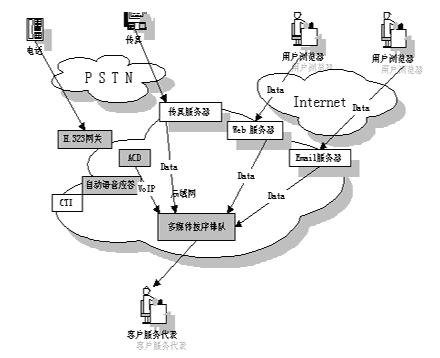 多媒體呼叫中心實(shí)際上是基于CTI 技術(shù)的傳統(tǒng)呼叫中心與 ICC 的相互結(jié)合,F(xiàn)在許多呼叫中心把各種媒體通信技術(shù)集成到了一起,允許座席員同時(shí)可以處理語音呼叫﹑Web請求﹑e-mail和傳真。其簡單示意圖如下:
