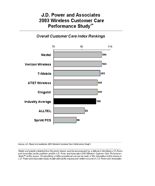 Nextel和Verizon移動在全部七家大型移動服務(wù)提供商的客戶服務(wù)表現(xiàn)中并列前茅。Nextel在自動應(yīng)答系統(tǒng)方面的表現(xiàn)特別好,尤其是指引/提示部分。Verizon移動則是在所有各個方面都表現(xiàn)超過平均值,特別是讓客服代表理解客戶的問題和比較短的打入客服中心后的電話等待時間方面。