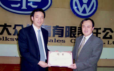 向一汽-大眾客服中心部長石濤(右)頒發(fā)“副主任委員”聘書