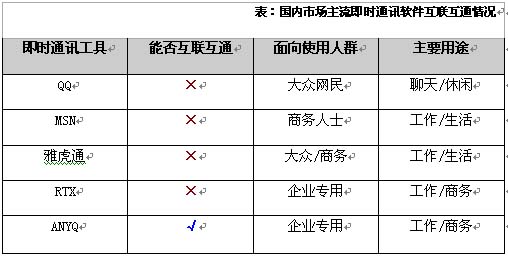 根據(jù)夏先生的提醒,筆者找到這了這個ANYQ的有關(guān)信息,據(jù)了解,該產(chǎn)品是面向企業(yè)用戶的一款商務(wù)協(xié)作軟件,其目的就是商務(wù)協(xié)作、統(tǒng)一通訊。因為該產(chǎn)品采用開放的國際標(biāo)準(zhǔn)協(xié)議——XMPP協(xié)議,使其具有聯(lián)系多個即時通訊信息孤島的能力。通過各個嵌入式的網(wǎng)關(guān),企業(yè)可以通過ANYQ與OICQ、ICQ、AIM、MSN、YAHOO上的客戶、合作伙伴進行聯(lián)系、實時交流、公文共享等企業(yè)來往。