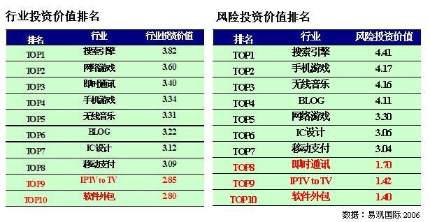 易觀國際投資分析師李璟對記者介紹:“本次評估中十大熱點領(lǐng)域的前8名都具有投資價值。但位居最后的 IPTV 和軟件外包行業(yè),雖然投資價值得分低于3分,并不代表其三年后沒有投資價值,易觀國際的行業(yè)投資價值評估模型是以3年作為一個評估周期的。我們認(rèn)為