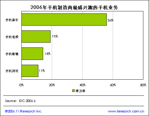 iResearch艾瑞市場咨詢根據(jù)IDC統(tǒng)計數(shù)據(jù)顯示,2006年手機(jī)制造商最感興趣的手機(jī)業(yè)務(wù)情況,手機(jī)音樂是手機(jī)制造商最感興趣的業(yè)務(wù),提及率達(dá)到56%,然后依次是手機(jī)電視19%、手機(jī)郵箱14%以及手機(jī)游戲11%.