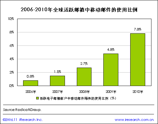 iResearch艾瑞市場咨詢根據(jù)市場咨詢公司RadicatiGroup公布的調(diào)查結(jié)果整理顯示,在2006年全球活躍電子郵箱賬號中有0.8%使用移動電子郵件服務(wù),移動電郵將會逐漸為高端用戶所接受,RadicatiGroup預(yù)計到2010年活躍電子郵箱賬號中使用移動電郵服務(wù)的比例將達(dá)到7.8%.