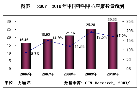 計世資訊(CCW Research)的研究成果《2006-2007年中國呼叫中心市場研究報告》預(yù)計,2007-2010年中國呼叫中心的產(chǎn)業(yè)投入規(guī)模平均年度復合增長率將超過20%,預(yù)計2007年中國呼叫中心投入規(guī)模將達到337.19億元,同比增長24.8%。由于2007、2009兩個年度中國呼叫中心將開始更換新的系統(tǒng)平臺,并開拓遠程座席市場,因此2007年的呼叫中心座席規(guī)模增長率高于2006年,2009年的呼叫中心座席規(guī)模增長率高于2008年。預(yù)計2007年中國呼叫中心座席數(shù)量將達到18.92萬個,同比增長14.9%;而2006年呼叫中心座席數(shù)量的同比增長率僅僅是8.7%,可見2007年的增長率比2006年的高出6.2個百分點。計世資訊(CCW Research)研究認為,2007年成為中國呼叫中心產(chǎn)業(yè)發(fā)展的轉(zhuǎn)折點,2007年中國開始進入第二波呼叫中心建設(shè)高潮期。