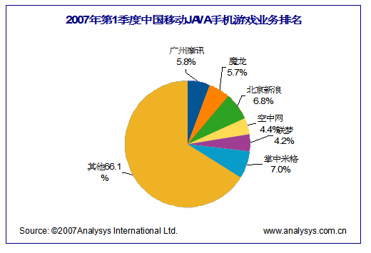 從企業(yè)實(shí)力和市場(chǎng)份額來(lái)看,目前手機(jī)游戲市場(chǎng)主要有三股力量組成,以空中等為代表的全業(yè)務(wù)線電信增值服務(wù)商(SP),以新浪等為代表的互聯(lián)網(wǎng)門(mén)戶(hù)綜合服務(wù)商,以米格、魔龍為代表的專(zhuān)業(yè)手機(jī)游戲產(chǎn)品與服務(wù)提供商(SP)。根據(jù)中國(guó)移動(dòng)“百寶箱”第1季度收入數(shù)據(jù),易觀注意到,掌中米格、北京新浪、廣州摩訊位列前三,前三名占據(jù)了近20%的市場(chǎng)份額。夢(mèng)網(wǎng)手機(jī)游戲精品業(yè)務(wù)的三家服務(wù)提供商第一季度收入排名為:米格、新浪、空中網(wǎng)!