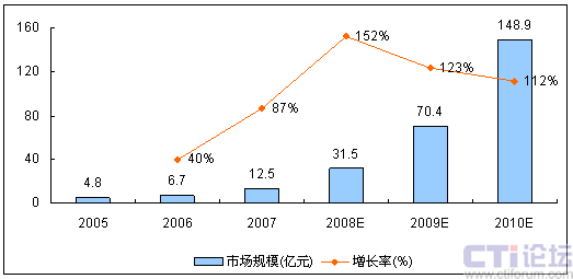 2008年移動(dòng)即時(shí)通信將達(dá)到增幅最高峰,市場(chǎng)規(guī)模實(shí)現(xiàn)31.5億元。2009年開(kāi)始,預(yù)計(jì)增幅將有所放緩,到2010年,市場(chǎng)規(guī)模將接近150億元。