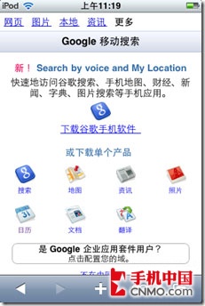Google for iPhone的界面針對iPhone/ipod touch下的safari做了優(yōu)化,富客戶端在手持設(shè)備上,無論界面還是速度都達(dá)到近乎完美的地步。