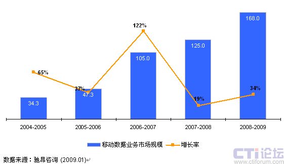 2008年中國移動(dòng)數(shù)據(jù)業(yè)務(wù)市場(chǎng)規(guī)模達(dá)168億美元