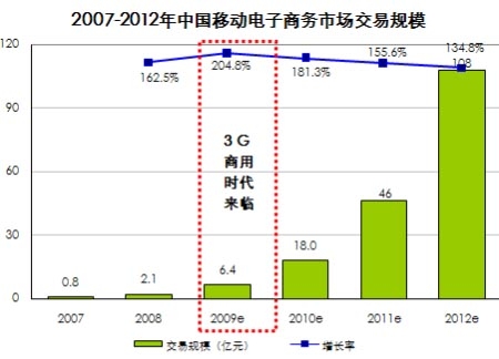 根據(jù)艾瑞咨詢即將發(fā)布的《2008-2009年中國移動電子商務(wù)行業(yè)發(fā)展報告》數(shù)據(jù)表明,08年中國移動電子商務(wù)市場交易規(guī)模為2.1億元,09年隨著3G商用時代到來,以及無線與傳統(tǒng)電子商務(wù)企業(yè)的紛紛試水,預(yù)計交易規(guī)模將達6.4億,同比增長約205%。艾瑞預(yù)計2012年移動電子商務(wù)交易規(guī)模將達到108億元,發(fā)展?jié)摿薮蟆?br />