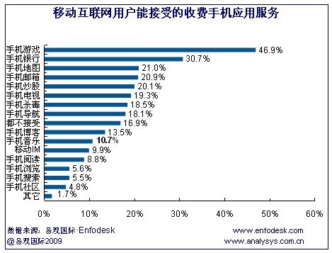 CTI論壇(ctiforum)06月22日消息:據(jù)易觀國際(Analysys International)《中國手機應用市場用戶調研報告2009》研究發(fā)現(xiàn),移動互聯(lián)網用戶可接受收費的應用主要是手機游戲和手機銀行/支付,其比例分別為47%和31%,而手機游戲也是移動互聯(lián)網用戶使用比例較高的手機應用服務之一。另外,用戶可接受程度較高的還包括手機郵箱、手機導航、手機炒股、手機電視/視頻以及手機殺毒等應用。而移動互聯(lián)網用戶對于手機社區(qū)和手機搜索收費的接受度較低。研究發(fā)現(xiàn),移動互聯(lián)網用戶可接受收費的應用主要是手機游戲和手機銀行/支付,其比例分別為47%和31%,而手機游戲也是移動互聯(lián)網用戶使用比例較高的手機應用服務之一。另外,用戶可接受程度較高的還包括手機郵箱、手機導航、手機炒股、手機電視/視頻以及手機殺毒等應用。而移動互聯(lián)網用戶對于手機社區(qū)和手機搜索收費的接受度較低。
