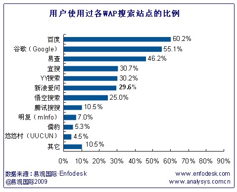 據(jù)易觀國際(Analysys International)《中國移動搜索市場用戶調(diào)研報告2009》研究發(fā)現(xiàn)此次調(diào)研樣本用戶使用過的各WAP搜索站點比例情況基本可以分為三個梯隊: