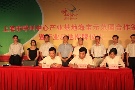 7月9日下午,上海市呼叫中心產業(yè)基地海寶示范園合作簽約暨產業(yè)基地揭牌儀式在寶山舉行。寶山區(qū)委常委、副區(qū)長夏雨,上海市呼叫協(xié)會理事長、中國電信號百信息服務有限公司副總經理韓友平為“上海市呼叫中心產業(yè)基地”和“海寶示范園”揭牌。