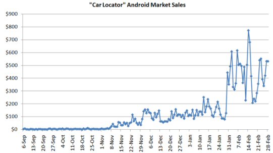 在被Android應(yīng)用商店列為特別應(yīng)用前,“汽車定位器”每天獲得的收入約為80至100美元。此后,其銷售額便大幅增加,平均每天達到435美元,情人節(jié)那天更是達到創(chuàng)紀錄的772美元。