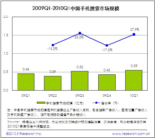 2010Q1中國手機搜索市場規(guī)模為5500萬,環(huán)比增長27.9%,手機搜索請求量和PV的大幅增長帶動廣告收入增加。自2009年下半年以來,受手機上網用戶規(guī)模迅速發(fā)展以及用戶活躍度和黏性顯著增加的影響,手機搜索市場進入快速發(fā)展階段。與此同時,手機搜索企業(yè)紛紛加大市場投入力度,建立與電信運營商和手機終端廠商的深度合作關系是業(yè)務拓展的重點方向。此外,網頁產品和客戶端軟件深度整合也是手機搜索企業(yè)布局移動互聯(lián)網市場的最佳實踐。受谷歌事件影響,艾瑞預計2010Q2手機搜索市場集中度將進一步提高。