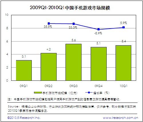 2010Q1中國手機游戲市場規(guī)模為5.4億,環(huán)比增長5.9%.2009年底電信運營商調整業(yè)務合作伙伴計費政策,導致WAP和G+手機游戲平臺等特定計費平臺暫時停止計費,對手機游戲市場營收增長產生不利影響。除了季節(jié)因素以外,手機單機游戲受電信運營商暫停WAP計費影響較大,手機網游受政策影響有限。盡管本季度手機游戲市場扭轉營收規(guī)模下滑的不利局面,重新恢復增長態(tài)勢,但是手機游戲對電信運營商計費通道的高依存度,決定行業(yè)受政策風險的影響較大。實現(xiàn)營收多元化是手機游戲業(yè)界思考和關注的問題。