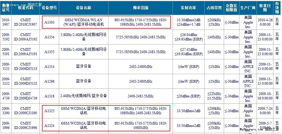 該機(jī)型號(hào)為A1303,明顯區(qū)別于目前在售的A1324(iPhone 3G)和A1325(iPhone 3GS)。而新機(jī)在設(shè)備名稱一欄中的信息更是值得關(guān)注,在原有“GSM/WCDMA/藍(lán)牙移動(dòng)電話機(jī)”的基礎(chǔ)上,A1303加入了WLAN(WAPI)功能,如傳言所說(shuō)一樣提供了對(duì)中國(guó)標(biāo)準(zhǔn)WAPI的支持,因而也終于迎來(lái)了WiFi的回歸。