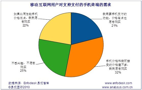 據(jù)Enfodesk易觀智庫(kù)最新報(bào)告《中國(guó)移動(dòng)互聯(lián)網(wǎng)市場(chǎng)用戶研究報(bào)告2010》研究發(fā)現(xiàn),目前在移動(dòng)互聯(lián)網(wǎng)用戶中,有75%的用戶對(duì)具有移動(dòng)支付功能的手機(jī)表現(xiàn)出明顯的興趣,其中影響不大,完全靠性價(jià)比決定是否購(gòu)買(mǎi)的用戶占比最多,約為32%,只有在移動(dòng)具備支付功能的手機(jī)和可接受價(jià)格相近時(shí)才會(huì)購(gòu)買(mǎi)。另外21%的人由于對(duì)移動(dòng)支付業(yè)務(wù)需求程度較高,愿意為此付出更高價(jià)格,其他22%的用戶則在比同性能手機(jī)價(jià)格低些之后,才會(huì)進(jìn)行消費(fèi)。除此之外,還有25%的用戶對(duì)于具備支付功能的手機(jī)沒(méi)有絲毫興趣,不愿意購(gòu)買(mǎi)。