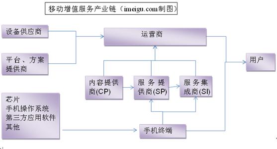 在移動(dòng)增值服務(wù)產(chǎn)業(yè)鏈當(dāng)中,運(yùn)營(yíng)商仍然處于核心地位。因?yàn)樗莆沼脩糍Y源和收費(fèi)渠道、具有網(wǎng)絡(luò)資源優(yōu)勢(shì),所以在移動(dòng)增值業(yè)務(wù)收入上 ,它可以完全獲得網(wǎng)絡(luò)流量費(fèi)、獲得消息類(lèi)業(yè)務(wù)的絕大部分,并且獲得內(nèi)容和服務(wù)的收入分成,部分市場(chǎng)這一分成比例高達(dá)50%。內(nèi)容提供商(CP)、服務(wù)提供商(SP)、服務(wù)集成商(SI)統(tǒng)稱為增值服務(wù)提供商。中國(guó)的移動(dòng)增值業(yè)務(wù)提供商,規(guī)模一般較小,依附于網(wǎng)絡(luò)運(yùn)營(yíng)商,依靠分成生存,受總體經(jīng)濟(jì)形勢(shì)和市場(chǎng)本身發(fā)展影響大,2008年增值電信業(yè)務(wù)經(jīng)營(yíng)者數(shù)量首次出現(xiàn)負(fù)增長(zhǎng),經(jīng)營(yíng)者數(shù)量同比減少5%,目前數(shù)量近2萬(wàn)家。