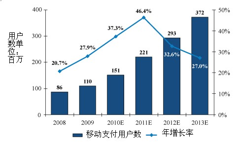 基于“中國(guó)計(jì)算機(jī)世界”的研究預(yù)測(cè),中國(guó)移動(dòng)支付用戶在2009年底達(dá)到1.1億,預(yù)計(jì)將在2013年超過(guò)3倍。由于需求大幅提高,電信運(yùn)營(yíng)商會(huì)繼續(xù)在每個(gè)省推出移動(dòng)支付解決方案網(wǎng)絡(luò)。反過(guò)來(lái),也會(huì)刺激第三方平臺(tái)和供應(yīng)商的發(fā)展。