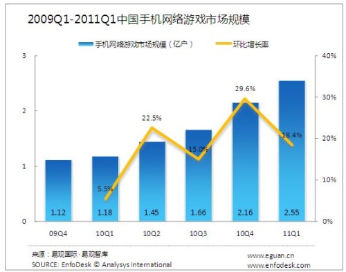 2011年第1季度中國手機(jī)網(wǎng)絡(luò)游戲市場(chǎng)規(guī)模達(dá)2.55億