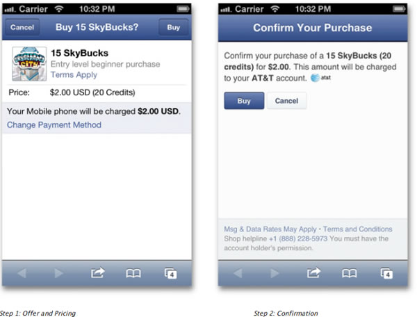 現(xiàn)在,針對(duì)應(yīng)用內(nèi)支付,F(xiàn)acebook聯(lián)合移動(dòng)運(yùn)營(yíng)商推出了便捷的支付服務(wù),允許用戶在購(gòu)買Facebook應(yīng)用開發(fā)商所提供的服務(wù)、游戲或者升級(jí)服務(wù)時(shí),直接將交易費(fèi)記到電話賬單當(dāng)中。整個(gè)流程被簡(jiǎn)化成2步:首先用戶選擇需要購(gòu)買的服務(wù),然后打開支付窗口,點(diǎn)擊確認(rèn)即可。