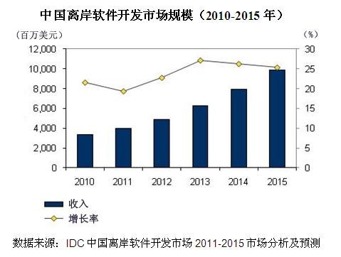 IDC數(shù)據(jù)顯示,2010年中國離岸軟件開發(fā)市場規(guī)模達(dá)到33.57億美元,同比增長21.6%,預(yù)計未來五年將以24.2% 的復(fù)合增長率快速攀升。