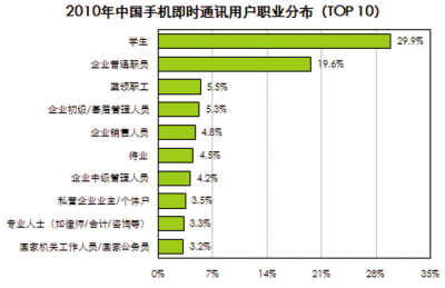 一系列研究數(shù)據(jù)足以說(shuō)明些問(wèn)題。研究公司艾瑞咨詢報(bào)告數(shù)據(jù)顯示,2010年中國(guó)手機(jī)上網(wǎng)用戶達(dá)到3.03億,在總網(wǎng)民數(shù)中占比約為66.3%。這其中,57.4%的用戶使用即時(shí)通訊服務(wù),位列手機(jī)上網(wǎng)用戶十大行為的第二位。