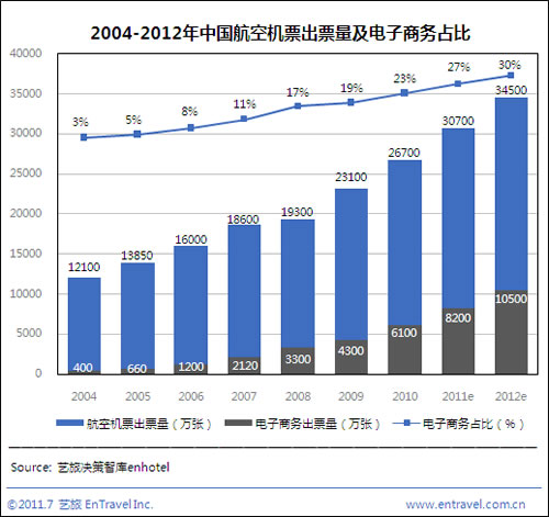 2011年上半年中國(guó)機(jī)票電子商務(wù)交易額達(dá)310億元,同期民航機(jī)票交易額為1250億元,電子商務(wù)占比升至25%,距美國(guó)45%的滲透率仍有差距。預(yù)計(jì)2011全年中國(guó)航空機(jī)票電子商務(wù)交易額將達(dá)640億元,而民航機(jī)票交易額將達(dá)2600億元。