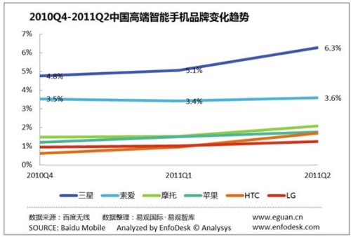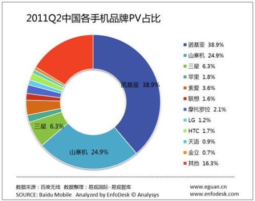 3、HTC、三星、摩托為代表的智能手機(jī)收益于Android得到快速發(fā)展。作為最早一批生產(chǎn)Android智能手機(jī)的廠商,HTC、三星、摩托羅拉等受益于Android的發(fā)展,PV份額保持增長。另外,第2季度HTC、三星、摩托基于Android的新機(jī)型上市也是PV占比增長的原因之一。