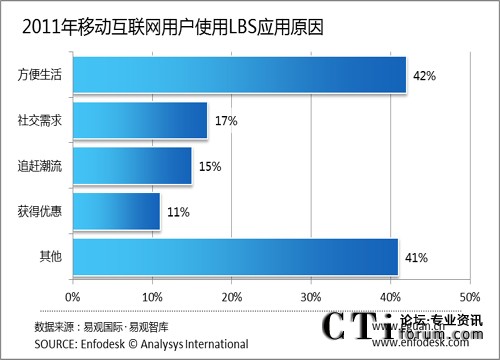 CTI論壇(ctiforum)8月26日消息(記者 張潔):根據(jù)易觀國際(Analysys international)最新調(diào)研顯示,42%的使用LBS用戶認為使用應用程序可以方便生活,17%的用戶認為是社交需求,15%的用戶只是出于追趕潮流的目的,11%的用戶認為使用LBS應用程序可以獲得一定的優(yōu)惠。