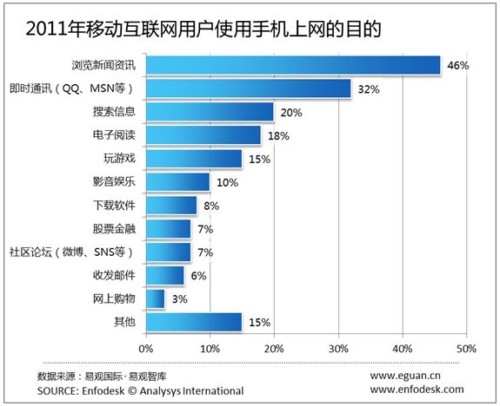 CTI論壇(ctiforum)9月1日消息(記者 潘婷婷):根據(jù)易觀國際對于中國移動(dòng)互聯(lián)網(wǎng)用戶最新調(diào)研數(shù)據(jù)顯示,2011年移動(dòng)互聯(lián)網(wǎng)用戶使用手機(jī)上網(wǎng)的目的中,瀏覽新聞資訊、即時(shí)通訊是集中度最高的兩個(gè)選擇,均占比30%以上,搜索信息、閱讀和玩游戲是用戶選擇的第二梯隊(duì),第三梯隊(duì)則是影音娛樂、下載軟件,股票金融和社交。