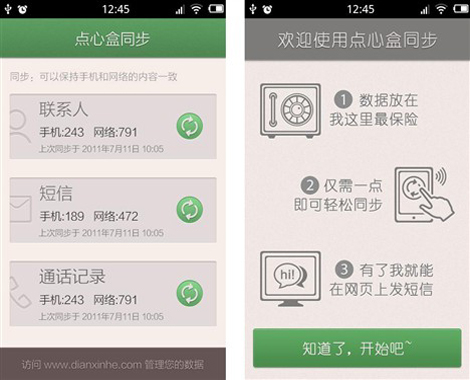 點心盒同步使用十分方便,在手機(jī)上安裝客戶端,通過注冊獲取賬號,登陸后進(jìn)入軟件的主界面,僅需輕點同步按鈕,即可將聯(lián)系人、短信和通話記錄同步到點心盒網(wǎng)站上。此時,不僅在手機(jī)端,用戶在云端通過點心盒網(wǎng)站也可以進(jìn)行聯(lián)系人新建、編輯和刪除的操作,并支持聯(lián)系人導(dǎo)入和去除重復(fù)的聯(lián)系人,方便聯(lián)系人管理。