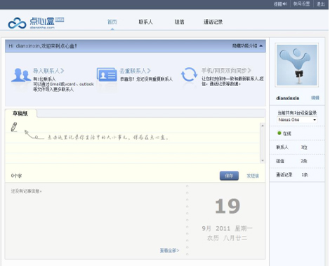 點心盒同步的另一特色功能就是云端收發(fā)短信和查看通話記錄。由于點心盒同步開啟自動同步之后是即時同步的,即使忘記帶手機(jī)也沒有關(guān)系,可以通過登陸點心盒網(wǎng)站來查看短信和通話記錄,這樣就可以看到?jīng)]帶手機(jī)期間誰聯(lián)系過自己,可通過云端進(jìn)行短信收發(fā),而且可利用云端來快速大量發(fā)送短信。用戶只需一臺可以上網(wǎng)的電腦或Pad,登錄點心盒,就可以隨時隨地打開網(wǎng)頁瀏覽手機(jī)里的資料。