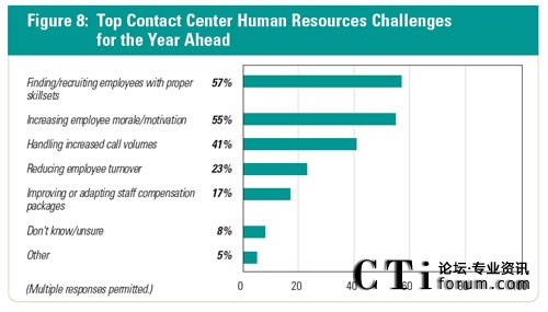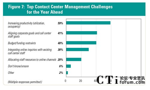 73%的公司表示,呼叫中心是公司面向客戶(hù)的窗口。 57%的呼叫中心管理者正在經(jīng)歷答疑或保持員工在中心擁有合適的技能。此外,41%的人表示,處理增加的呼叫量是呼叫中心未來(lái)一年面臨的主要挑戰(zhàn)。