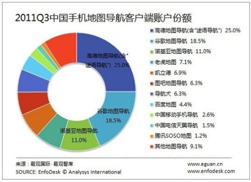 谷歌:以18.5%的綜合份額占據(jù)中國(guó)手機(jī)地圖導(dǎo)航客戶(hù)端市場(chǎng)排名次席。其中,谷歌地圖仍舊以27%的份額占據(jù)手機(jī)地圖客戶(hù)端市場(chǎng)第一的位置,但因?yàn)槠浣?jīng)營(yíng)策略和中國(guó)國(guó)內(nèi)政策等原因,谷歌地圖在內(nèi)地行貨版安卓手機(jī)中普遍被閹割,在一定程度上影響了谷歌地圖市場(chǎng)占有率的進(jìn)? 徊教嶸A磽,业娇N氈樵げ餛還雜惺只贗疾方魑筆旨隊(duì)τ迷趇Phone5中推出,這有可能撼動(dòng)谷歌地圖在IOS平臺(tái)的統(tǒng)治地位。