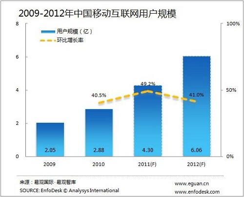 基于EnfoDesk易觀智庫對移動互聯(lián)網(wǎng)的持續(xù)研究,預(yù)計(jì)2012年市場用戶規(guī)模及從移動互聯(lián)網(wǎng)市場規(guī)模保持相對穩(wěn)定的增長,移動互聯(lián)網(wǎng)用戶數(shù)有機(jī)會在2012年突破6億,并且超過互聯(lián)網(wǎng)用戶數(shù)量,智能終端、移動互聯(lián)網(wǎng)應(yīng)用繼續(xù)延續(xù)2011年的增長速度。